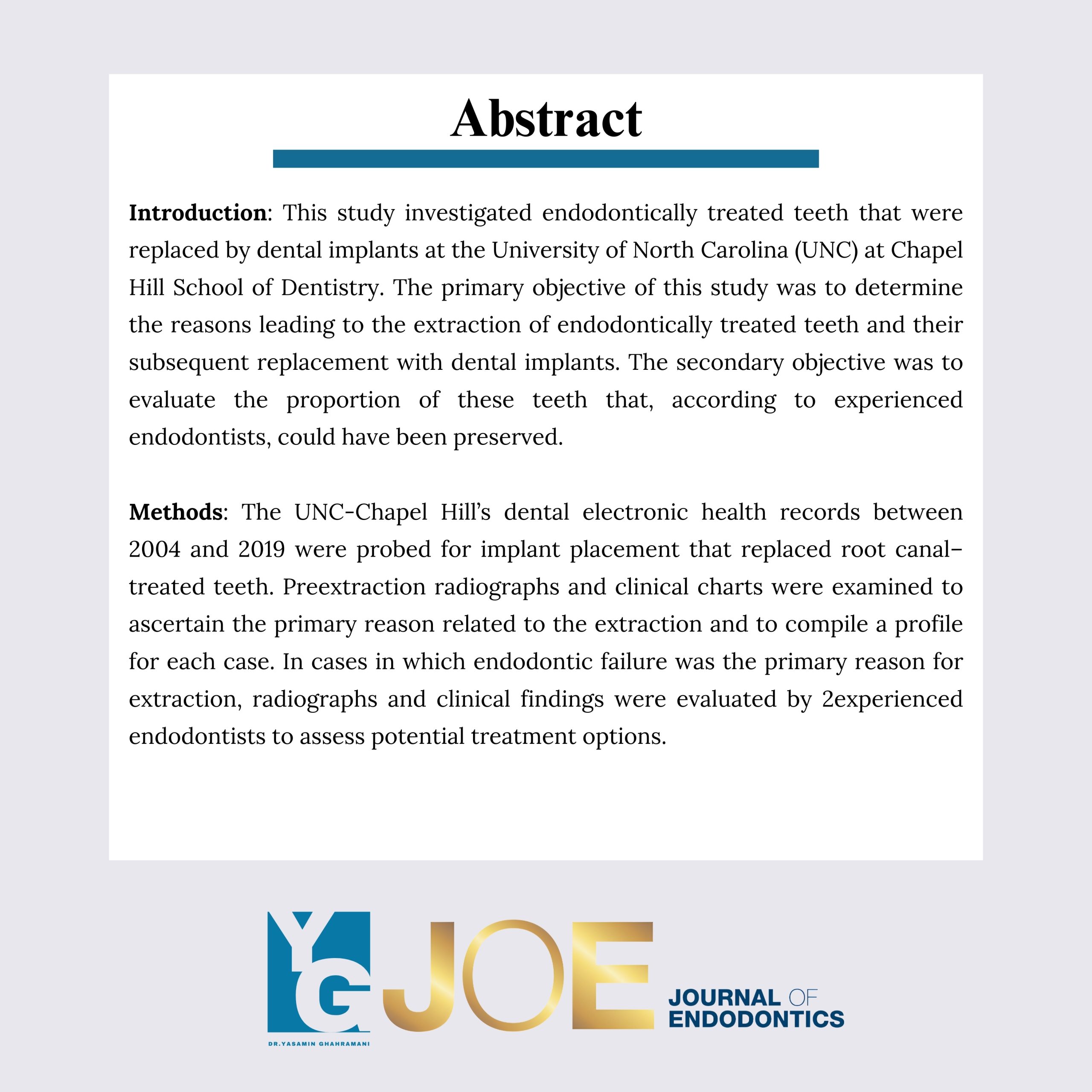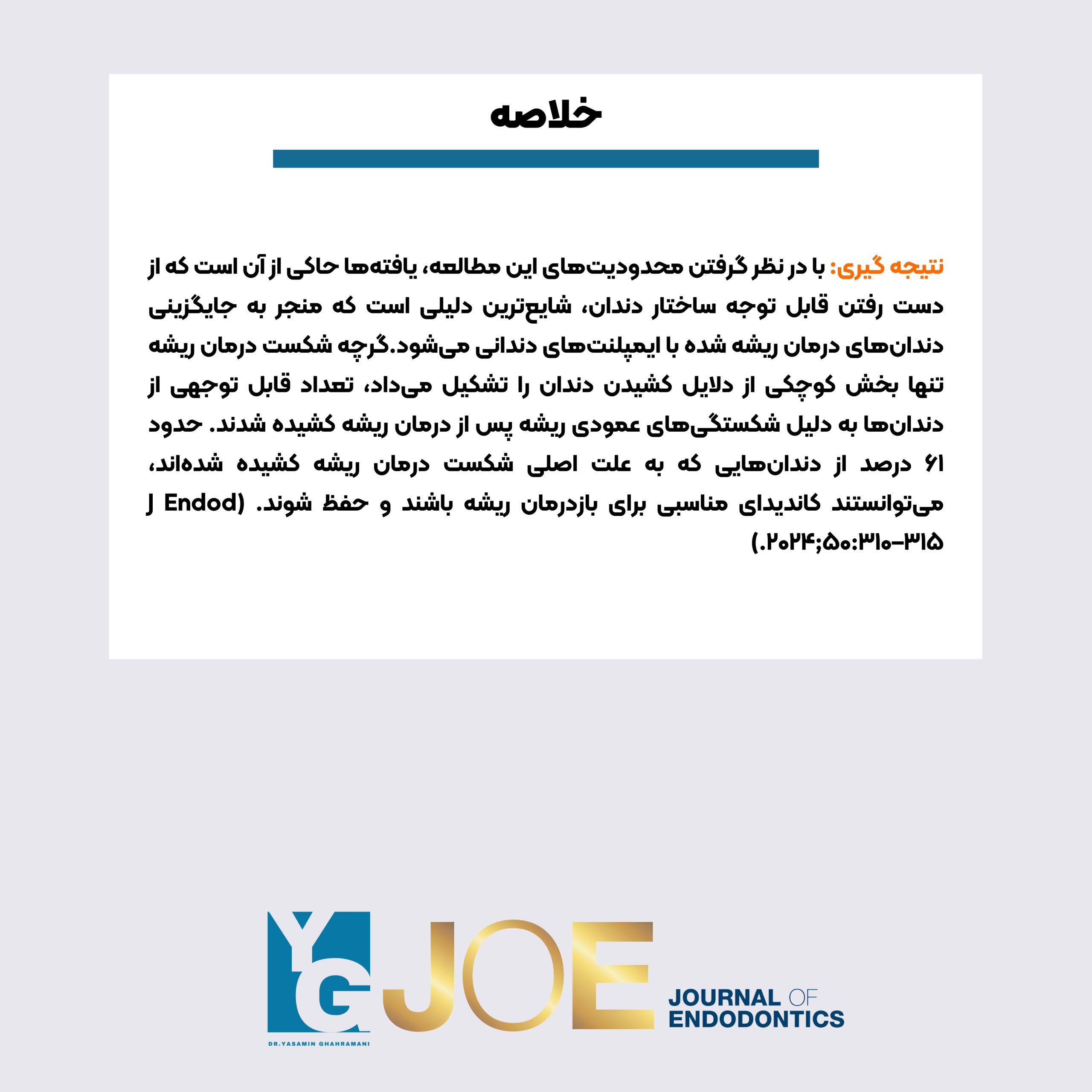 با در نظر گرفتن محدودیتهای این مطالعه، یافتهها حاکی از آن است که از دست رفتن قابل توجه ساختار دندان، شایعترین دلیلی است که منجر به جایگزینی دندانهای درمان ریشه شده با ایمپلنتهای دندانی میشود.گرچه شکست درمان ریشه تنها بخش کوچکی از دلایل کشیدن دندان را تشکیل میداد، تعداد قابل توجهی از دندانها به دلیل شکستگیهای عمودی ریشه پس از درمان ریشه کشیده شدند. حدود 61 درصد از دندانهایی که به علت اصلی شکست درمان ریشه کشیده شدهاند، میتوانستند کاندیدای مناسبی برای بازدرمان ریشه باشند و حفظ شوند. (J Endod 2024;50:310–315.)